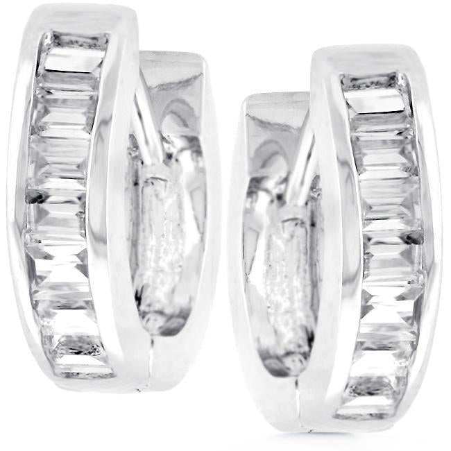 Baguette stones line up a huggie style hoop for a classic put-together look. Our genuine rhodium finish is achieved using an electroplating process that coats the item with heavy layers of rhodium a close cousin to platinum which gives our jewelry a platinum luster.