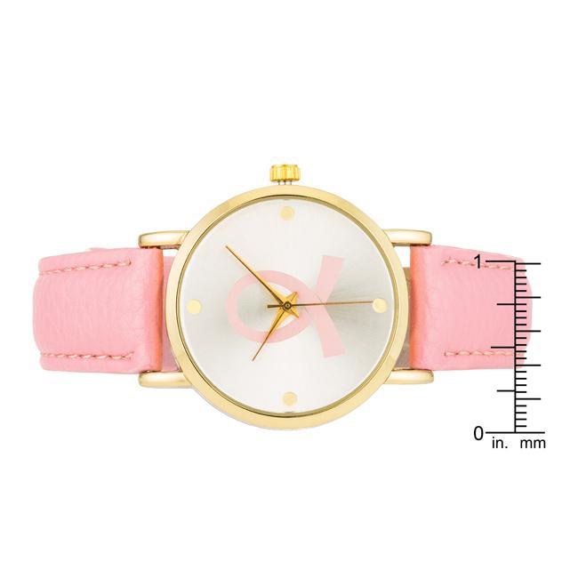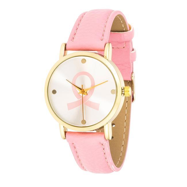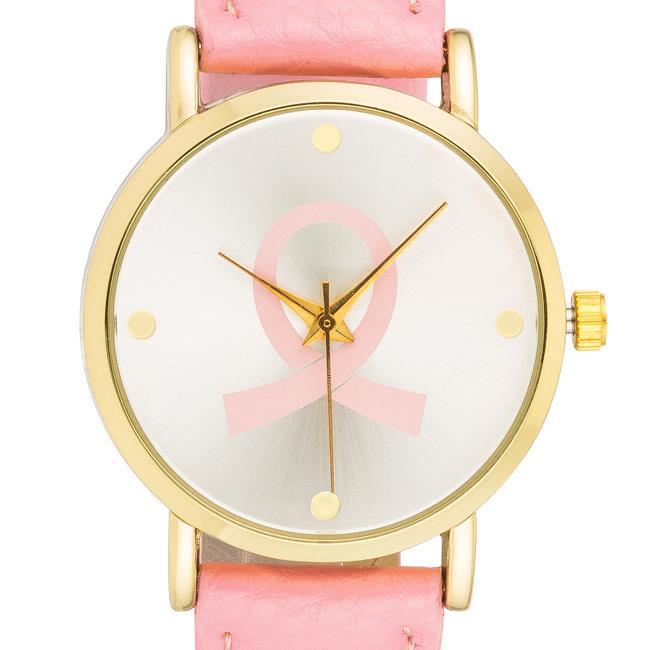 This elegant watch also comes with a message. On the watch face is a pink ribbon to symbolize breast cancer awareness. Goldtone hands and goldtone dots at the 3 6 9 and 12 oclock make for an elegant look accentuated by the goldtone case.