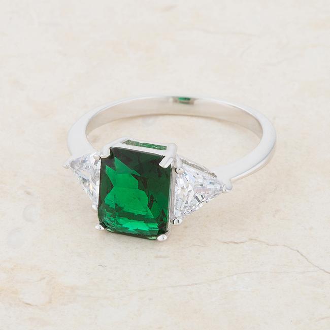 A pair of clear trillion cut stones accompany an aqua radiant cut center stone in this elegant 4.5ct CZ engagement ring. A modern twist on a classic piece. Our genuine rhodium finish is achieved using an electroplating process that coats the item with heavy layers of rhodium a close cousin to platinum. This gives our jewelry a platinum luster.
