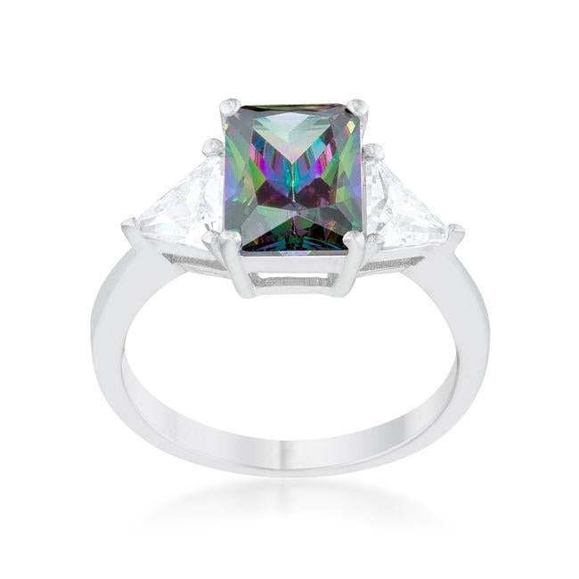 A pair of clear trillion cut stones accompany a sapphire emerald cut center stone in this elegant 4.5 carat engagement ring. A modern twist on a classic piece. Our genuine rhodium finish is achieved using an electroplating process that coats the item with heavy layers of rhodium a close cousin to platinum. This gives our jewelry a platinum luster.