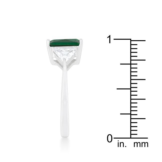 A pair of clear trillion cut stones accompany a sapphire emerald cut center stone in this elegant 4.5 carat engagement ring. A modern twist on a classic piece. Our genuine rhodium finish is achieved using an electroplating process that coats the item with heavy layers of rhodium a close cousin to platinum. This gives our jewelry a platinum luster.
