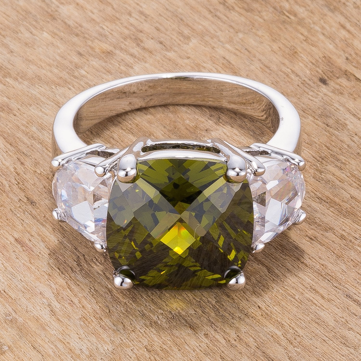 Crafted from rhodium and embellished with fine cut cubic zirconia this unique three stone ring can be fashioned for any occasion. Our genuine rhodium finish is achieved using an electroplating process that coats the item with heavy layers of rhodium a close cousin to platinum which gives our jewelry a platinum luster.