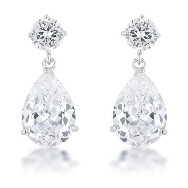 These beauties sparkle from a distance! With a round cubic zirconia at the stud and a dangling pear-shaped cubic zirconia the sparkle is over the top. The metal is rhodium plated the same coating used for white gold. These charming earrings will make any girl shine.