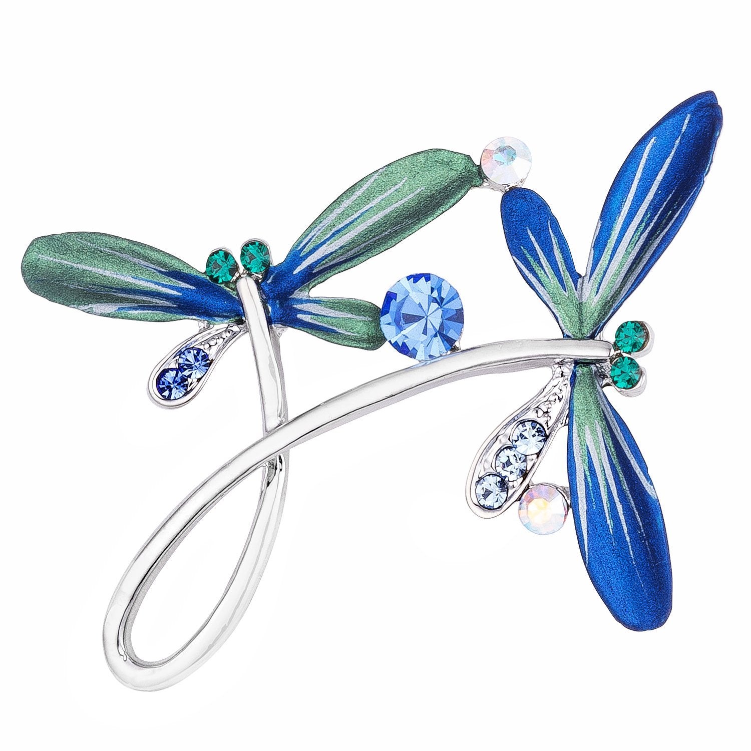 Silvertone Hand Painted Blue Enamel Crystal Accented Flying Dragonflies Brooch