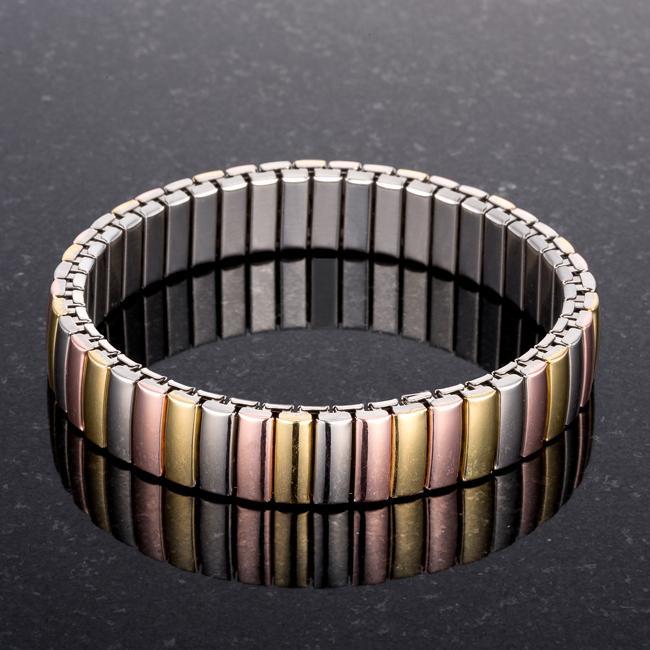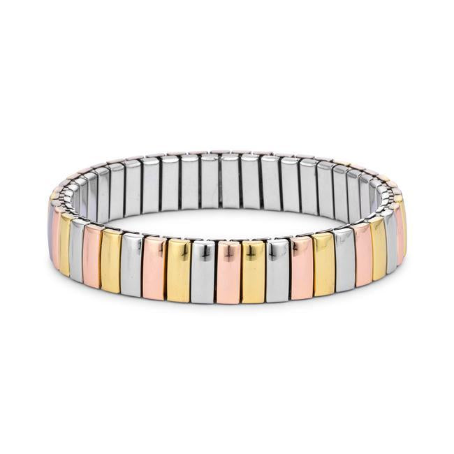 This colorful and playful bracelet is a conversation started. Crafted from stainless steel for durability and alternating hues of gold silver and rosegold for a playful and beautiful lookthis stretch bracelet is filled with fun and personality.