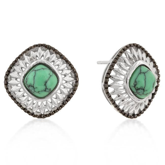 Antique styling and a turquoise cut cabochon add uniqueness and character to this earring set. Our two-tone and tri-tone process use 18k gold that electroplated coating the item with heavy layers of 18k yellow gold giving it that 14k hamiliton gold polished look. The silver tone is achieved by applying a heavy coating of genuine rhodium to the item giving is a lustrous silver tone high polish.