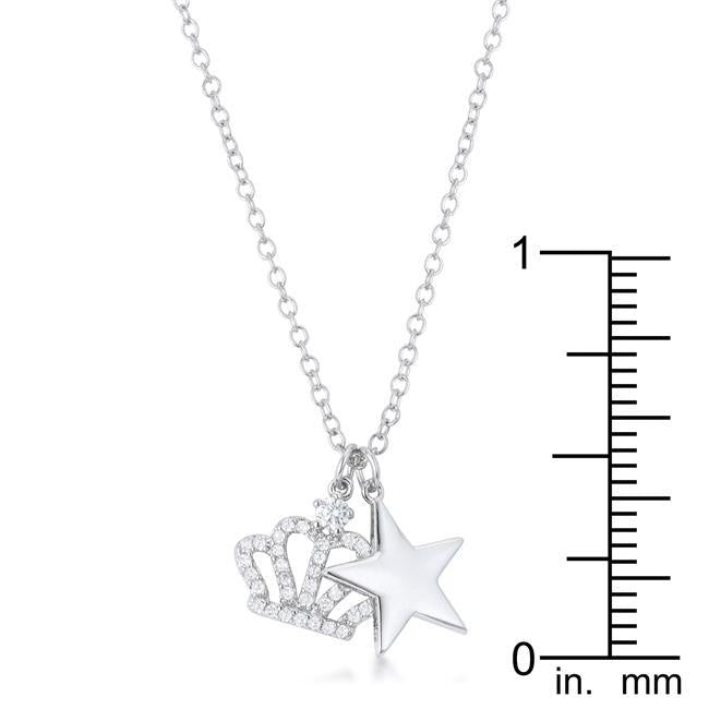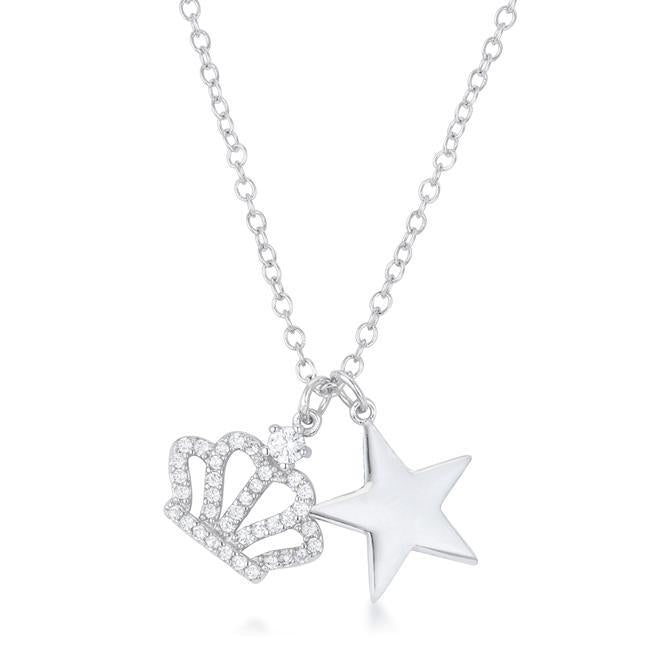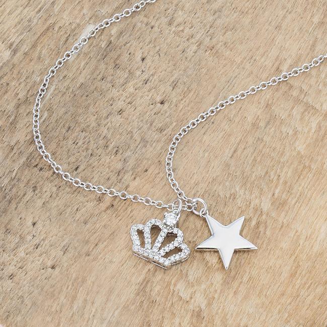 This gorgeous rhodium-plated pendant features a beautiful pave cz crown charm and is complemented by a star charm making it a must-have in any jewelry collection. The necklace is also rhodium-plated and 16 + 2 extender.